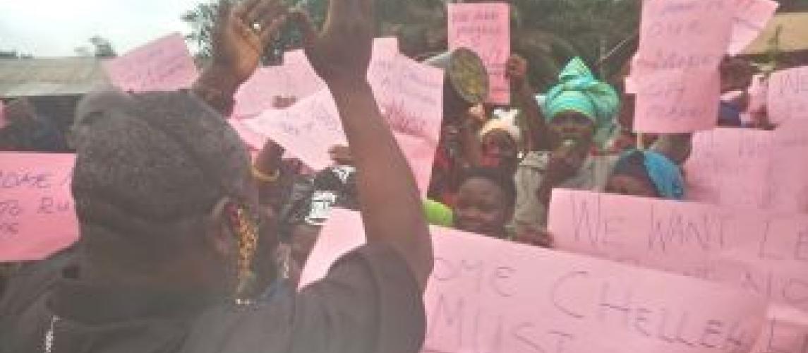 Upon his arrival in County, Minister Sirleaf was greeted with huge protest against Mayor Jerome Chelleh by business people, motorcyclists, youth and women on grounds that the Mayor is using force to implement the City Ordinance, imposing huge fees and unilaterally running the City without a City Council, among other accusations.